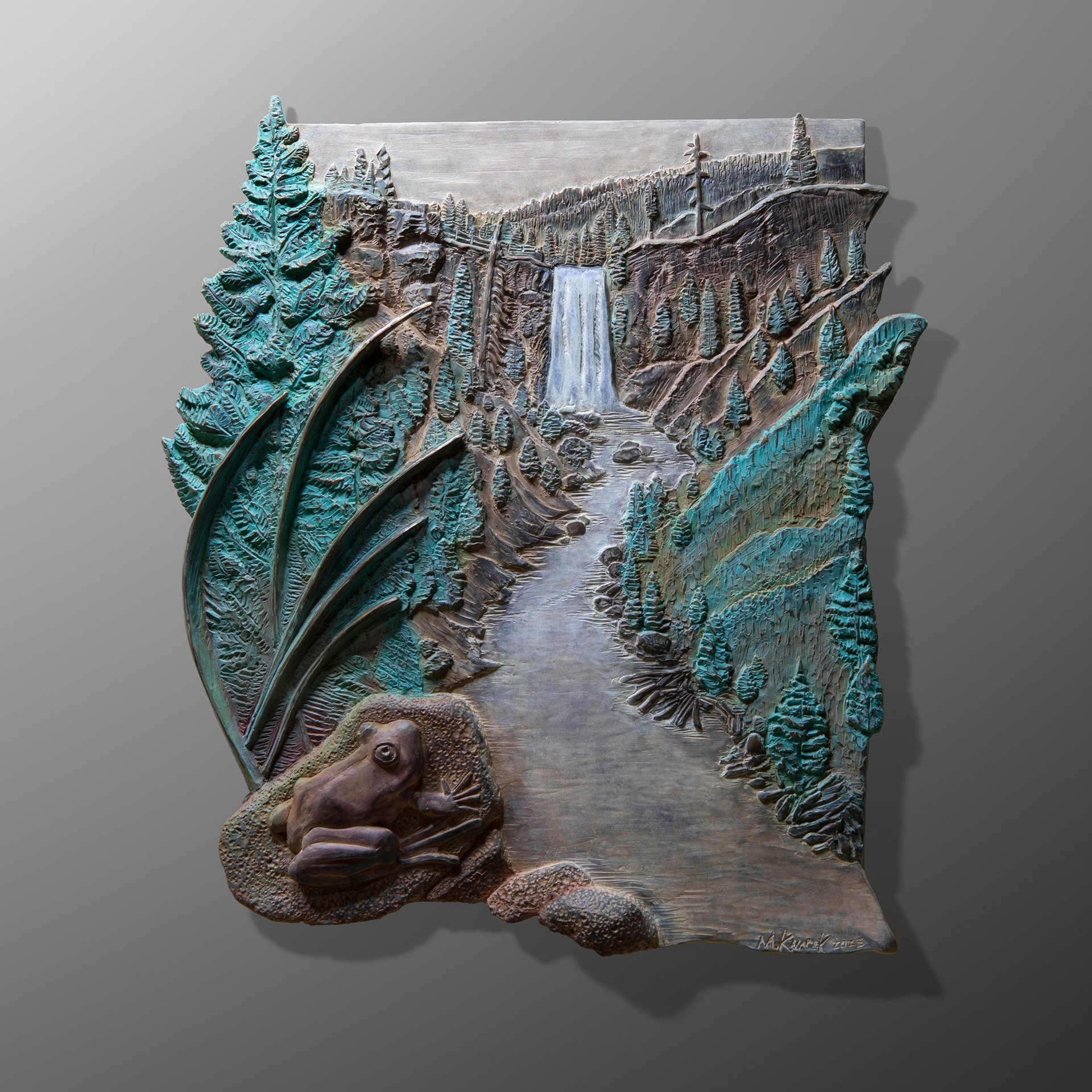 Bronze wall relief sculpture of Tumalo Falls featuring the Oregon Spotted Frog. It's patina evokes a cool summer morning, highlighting cascading water and lush forest surroundings.